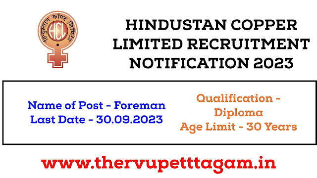 ஹிந்துஸ்தான் காப்பர் லிமிடெட் நிறுவனத்தில் Assistant Foreman, Mining Mate Grade I பணிகளுக்கு காலியிடங்கள் உள்ளதாக அறிவிப்பு வெளியாகியுள்ளது. தகுதியும் விருப்பமும் உள்ளவர்கள் கீழ்காணும் தகவல்களை படித்து 30-09-2023க்குள் விண்ணப்பிக்கலாம்.